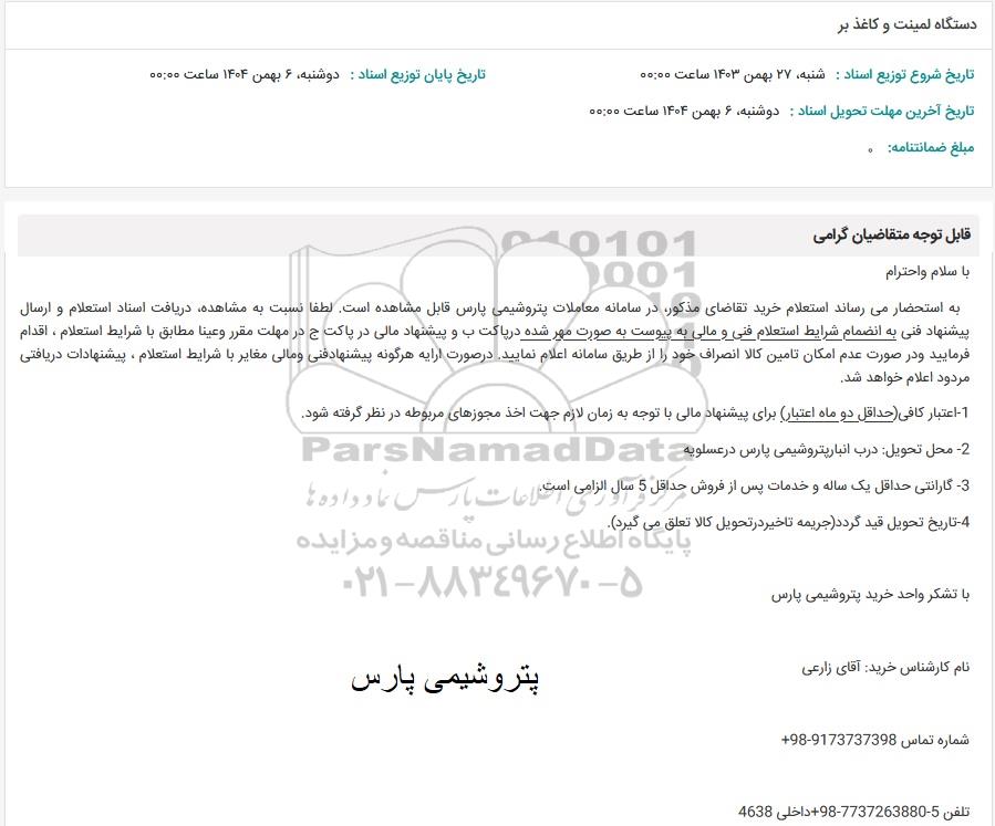 به استحضار می رساند استعلام خرید تقاضای مذکور در سامانه معاملات پتروشیمی پارس قابل مشاهده است. لطفا نسبت به مشاهده، دریافت اسناد استعلام و ارسال پیشنهاد فنی به انضمام شرایط استعلام فنی و مالی به پیوست به صورت مهر شده در پاکت ب و پیشنهاد مالی در پاکت ج در مهلت مقرر و عینا مطابق با شرایط استعلام، اقدام فرمایید و در صورت عدم امکان تامین کالا انصراف خود را از طریق سامانه اعلام نمایید در صورت ارایه هرگونه پیشنهاد فنی و مالی مغایر با شرایط استعلام، پیشنهادات دریافتی مردود اعلام خواهد شد.