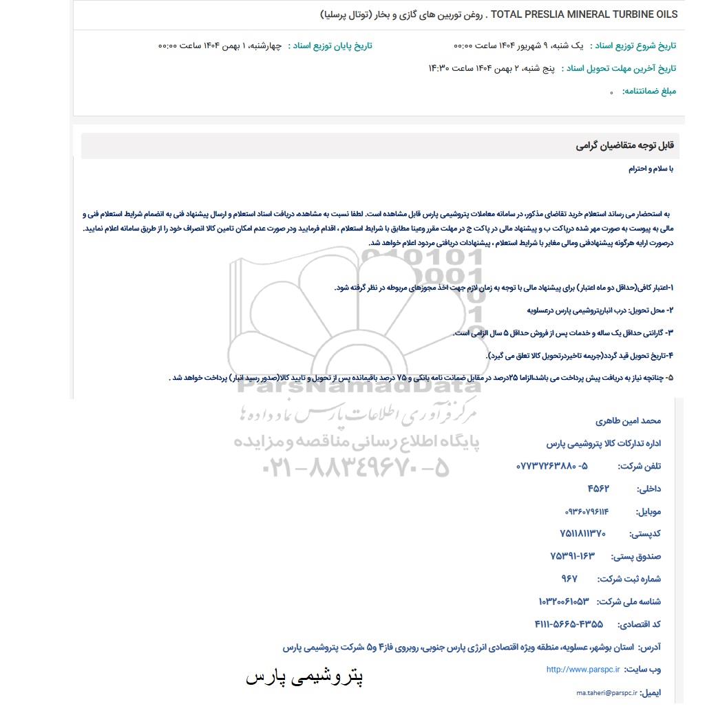 به استحضار می رساند استعلام خرید تقاضای مذکور در سامانه معاملات پتروشیمی پارس قابل مشاهده است. لطفا نسبت به مشاهده دریافت اسناد استعلام و ارسال پیشنهاد فنی به انضمام شرایط استعلام فنی و مالی به پیوست به صورت مهر شده در پاکت ب و پیشنهاد مالی در پاکت ج در مهلت مقرر وعینا مطابق با شرایط استعلام اقدام فرمایید و در صورت عدم امکان تامین کالا انصراف خود را از طریق سامانه اعلام نمایید. در صورت ارایه هرگونه پیشنهادفنی و مالی مغایر با شرایط استعلام . پیشنهادات دریافتی مردود اعلام خواهد شد.