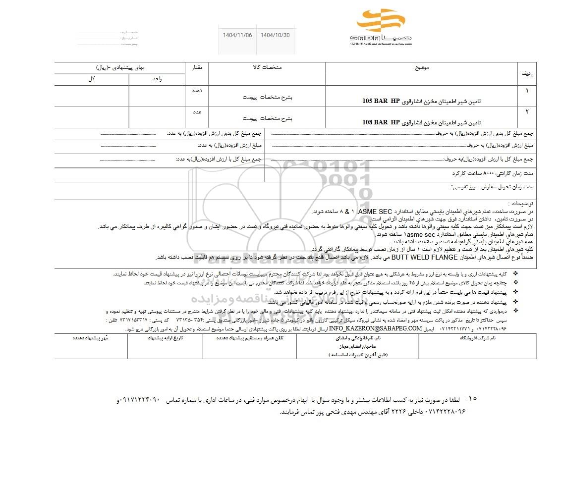 استعلام تامین شیر اطمینان مخزن فشار قوی 105 BAR HP, استعلام تامین شیر اطمینان مخزن فشار قوی 105 BAR HP