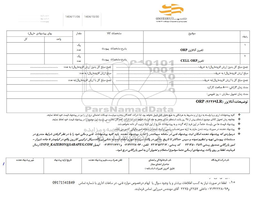| 1 | تامین انالایزر ORP | بشرح مشخصات پیوست | یک عدد |