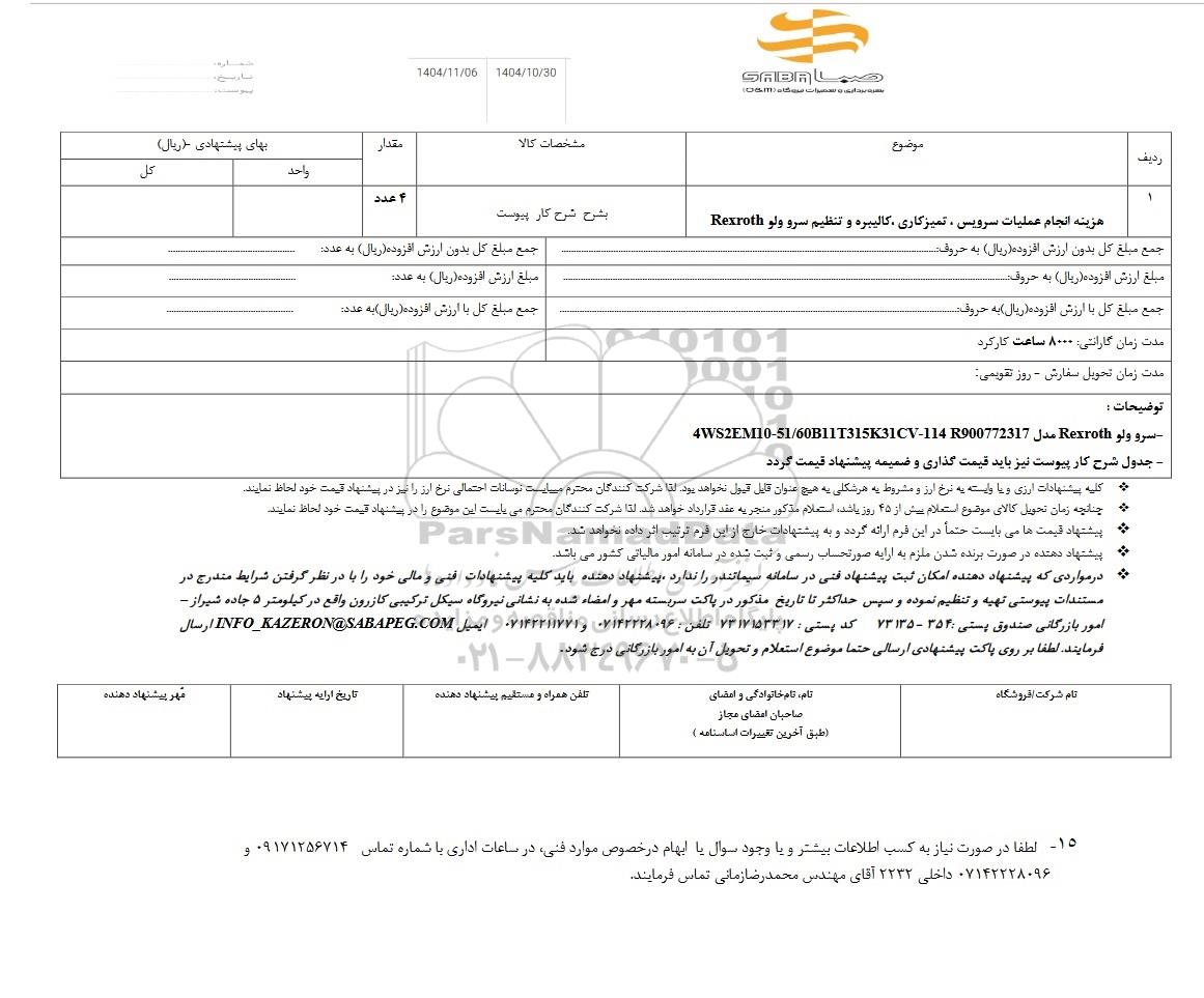 | 1 | هزینه انجام عملیات سرویس،تمیزکاری، کالیبره و تنظیم سرور ولو REXROTH | بشرح مشخصات پیوست | 4 عدد |