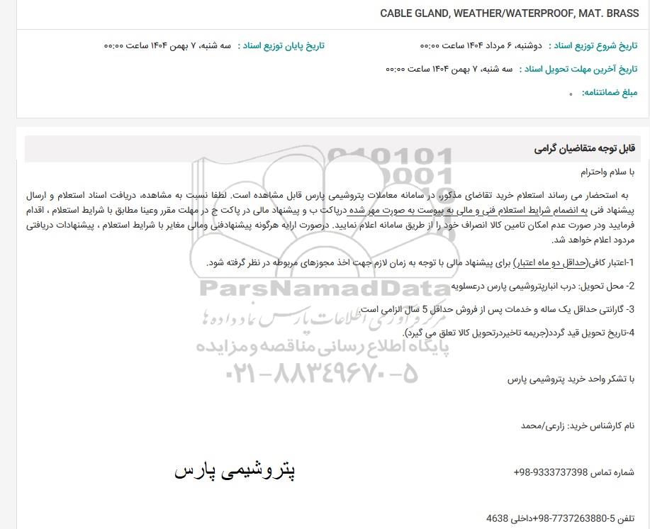 به استحضار می رساند استعلام خرید تقاضای مذکور در سامانه معاملات پتروشیمی پارس قابل مشاهده است. لطفا نسبت به مشاهده دریافت اسناد استعلام و ارسال پیشنهاد فنی به انضمام شرایط استعلام فنی و مالی به پیوست به صورت مهر شده در پاکت ب و پیشنهاد مالی در پاکت ج در مهلت مقرر وعينا مطابق با شرایط استعلام ، اقدام فرمایید و در صورت عدم امکان تامین کالا انصراف خود را از طریق سامانه اعلام نمایید. در صورت ارایه هرگونه پیشنهاد فنی و مالی مغایر با شرایط استعلام ، پیشنهادات دریافتی مردود اعلام خواهد شد.