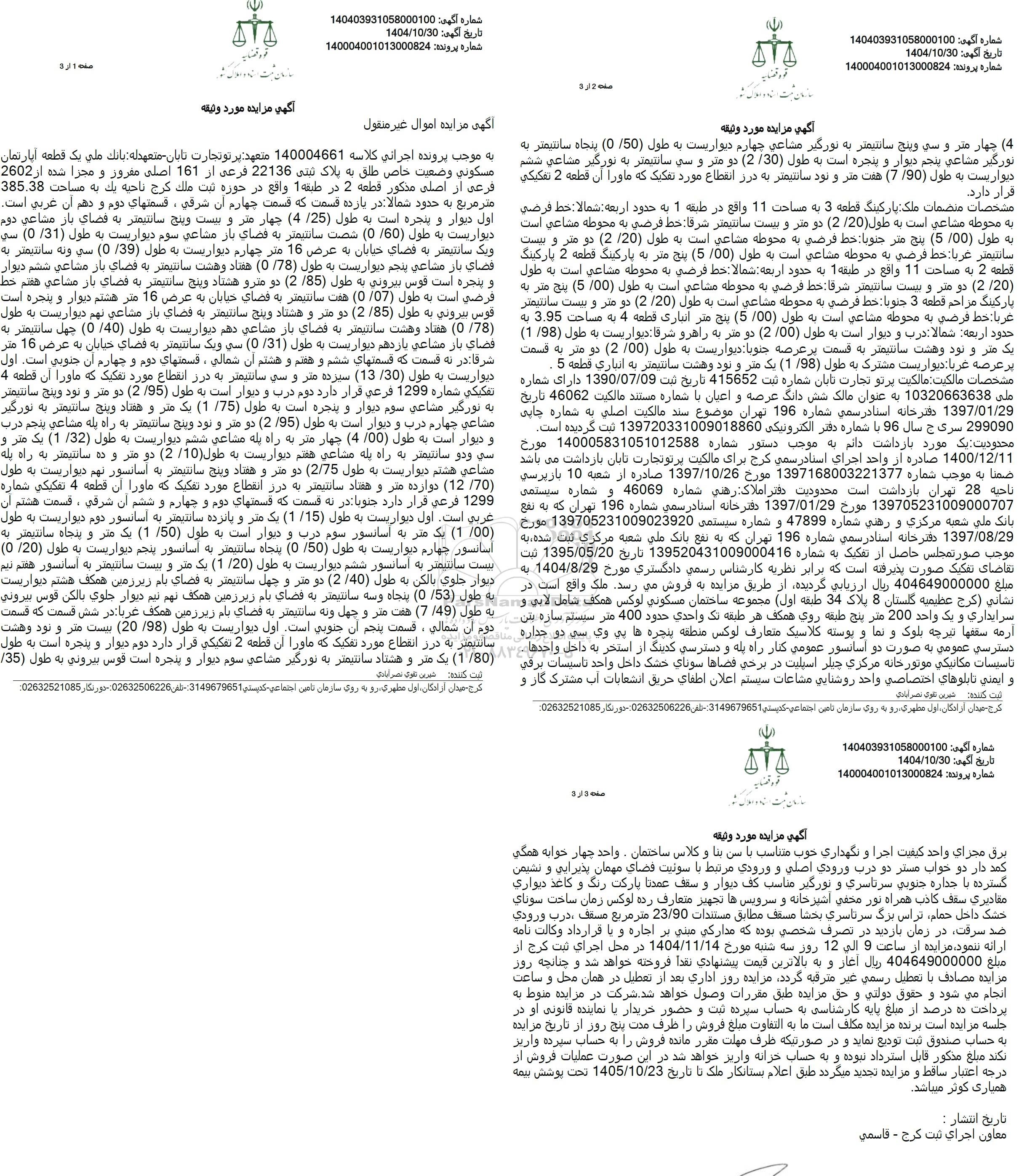 مزایده فروش یک قطعه آپارتمان مسکونی وضعیت خاص طلق به پلاک ثبتی 22136 فرعی از 161 اصلی مفروز و مجزا شده از 2602 فرعی از اصلی مذکور قطعه 2 در طبقه 1 واقع در حوزه ثبت ملک کرج ناحیه یک به مساحت 385.38 مترمربع به مبلغ 404649000000 ریال
