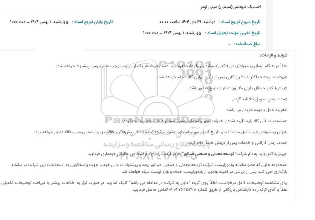 در صورت نیاز به دریافت راهنمایی یا پشتیبانی در خصوص استعلام و مناقصه و فراخوان مناقصه عمومی، مناقصه محدود، مناقصه بین‌ المللی، مناقصه دولتی، مناقصه خصوصی، مناقصه آنلاین فروش تجهیزات، مناقصه مشاوره‌ای مناقصه پتروشیمی و انرژی مناقصه صنایع و تجهیزات برق و مخابرات و نفت و گاز ... لطفاً با سایت خبری مناقصه و مزایده پارس‌نماد داده‌ها به شماره 88349670 تماس حاصل فرمایید.