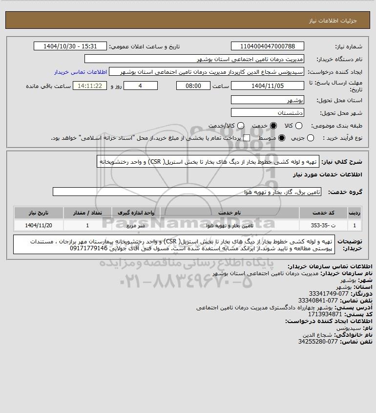 شرح کلی نیاز: تهیه و لوله کشی خطوط بخار از دیگ های بخار تا بخش استریل( CSR) و واحد رختشویخانه