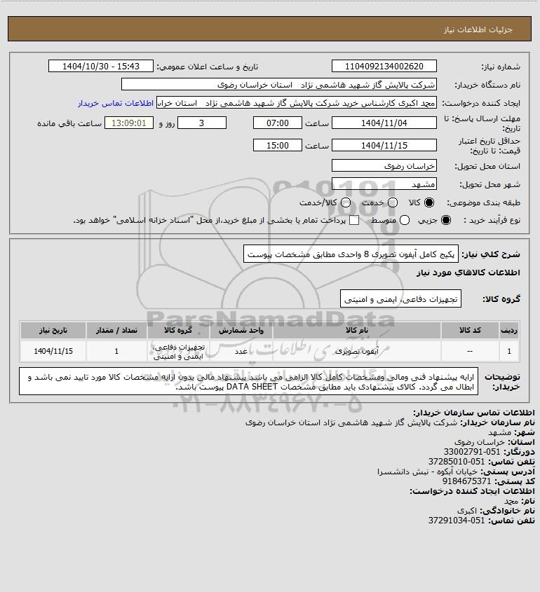 نام دستگاه خریدار:شرکت پالایش گاز شهید هاشمی نژاد استان خراسان رضوی