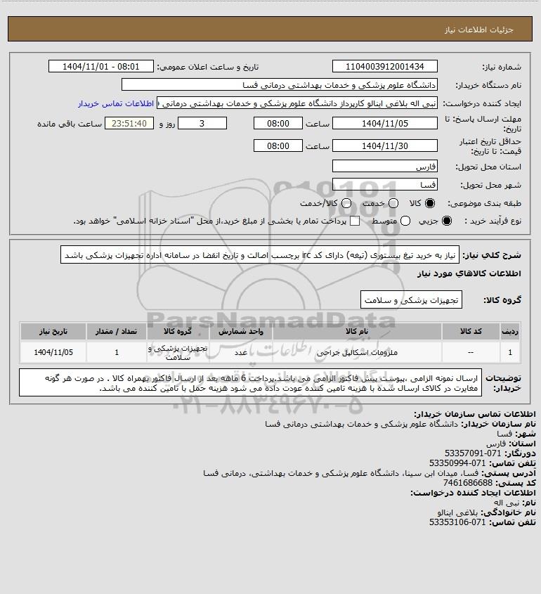 استعلام نیاز به خرید تیغ بیستوری (تیغه) دارای کد irc برچسب اصالت و تاریخ انقضا در سامانه اداره تجهیزات پزشکی باشد, استعلام نیاز به خرید تیغ بیستوری (تیغه) دارای کد irc برچسب اصالت و تاریخ انقضا در سامانه اداره تجهیزات پزشکی باشد