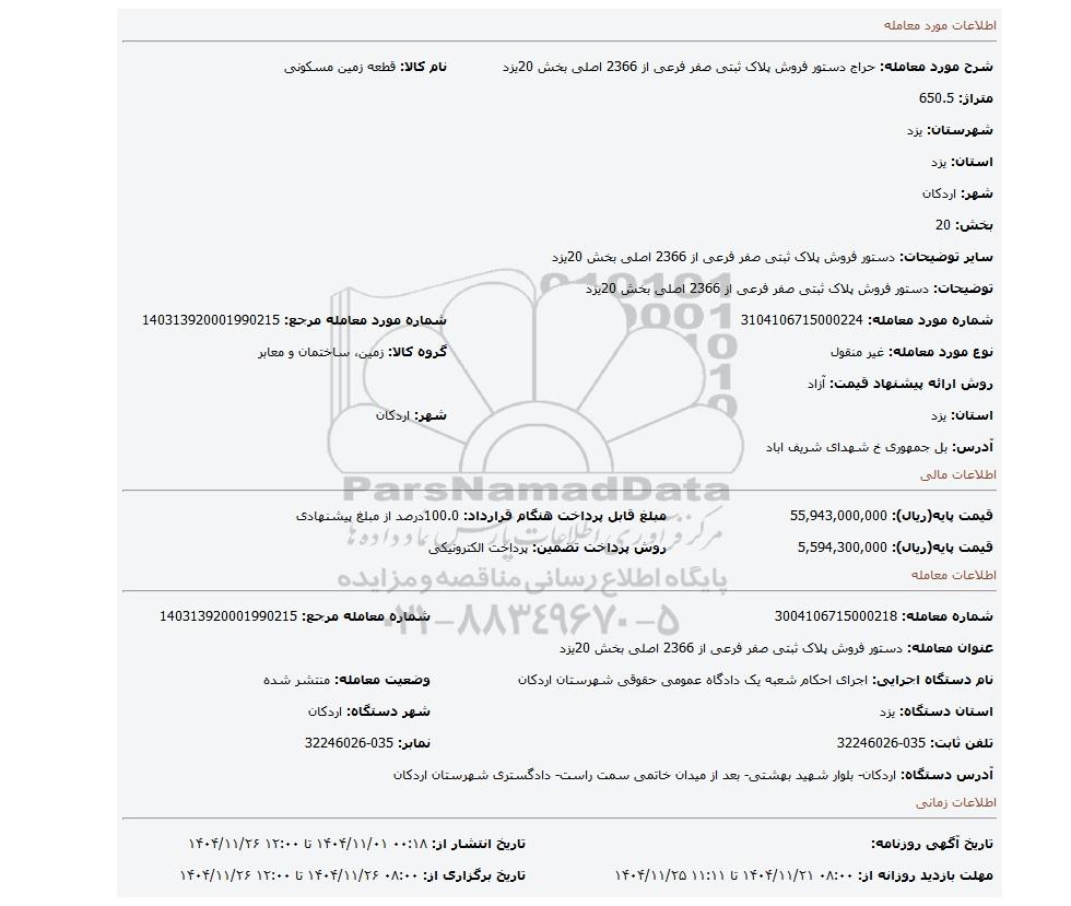 | عنوان معامله: دستور فروش پلاک ثبتی صفر فرعی از 2366 اصلی بخش 20یزد | ||
