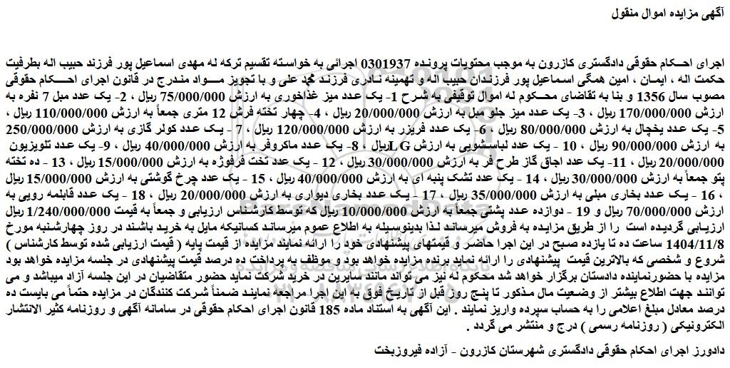 اجرای احــکام حقوقی دادگستری کازرون به موجب محتویات پرونده 0301937 اجرائی به خواسته تقسیم ترکه له مهدی اسماعیل پور فرزند حبیب اله بطرفیت حکمت اله ، ایمان ، امین همگی اسماعیل پور فرزندان حبیب اله و تهمینه نادری فرزند محمد علی و با تجویز مــــواد مندرج در قانون اجرای احــــکام حقوقی مصوب سال 1356 و بنا به تقاضای محــکوم له اموال توقیفی به شرح 1- یک عدد میز غذاخوری به ارزش 75/000/000 ریال ، 2- یک عدد مبل 7 نفره به ارزش 170/000/000 ریال ، 3- یک عدد میز جلو مبل به ارزش 20/000/000 ریال ، 4- چهار تخته فرش 12 متری جمعاً به ارزش 110/000/000 ریال ، 5- یک عدد یخچال به ارزش 80/000/000 ریال ، 6- یک عدد فریزر به ارزش 120/000/000 ریال ، 7 - یک عدد کولر گازی به ارزش 250/000/000 ریال ، 8- یک عدد ماکروفر به ارزش 40/000/000 ریال ، 9- یک عدد تلویزیون lg به ارزش 90/000/000 ریال ، 10 - یک عدد لباسشویی به ارزش 20/000/000 ریال ، 11- یک عدد اجاق گاز طرح فر به ارزش 30/000/000 ریال ، 12 - یک عدد تخت فرفوژه به ارزش 15/000/000 ریال ، 13 - ده تخته پتو جمعاً به ارزش 30/000/000 ریال ، 14 - یک عدد تشک پنبه ای به ارزش 40/000/000 ریال ، 15 - یک عدد چرخ گوشتی به ارزش 15/000/000 ریال ، 16 - یک عدد بخاری مبلی به ارزش 35/000/000 ریال ، 17 - یک عدد بخاری دیواری به ارزش 20/000/000 ریال ، 18 - یک عدد قابلمه رویی به ارزش 70/000/000 ریال و 19 - دوازده عدد پشتی جمعاً به ارزش 10/000/000 ریال که توسط کارشناس ارزیابی و جمعاً به قیمت 1/240/000/000 ریال ارزیابی گردیده است را از طریق مزایده به فروش میرساند لذا بدینوسیله به اطلاع عموم میرساند کسانیکه مایل به خرید باشند در روز چهارشنبه مورخ 1404/11/8 ساعت ده تا یازده صبح در این اجرا حاضر و قیمتهای پیشنهادی خود را ارائه نمایند مزایده از قیمت پایه ( قیمت ارزیابی شده توسط کارشناس ) شروع و شخصی که بالاترین قیمت پیشنهادی را ارائه نماید برنده مزایده خواهد بود و موظف به پرداخت ده درصد قیمت پیشنهادی در جلسه مزایده خواهد بود مزایده با حضورنماینده دادستان برگزار خواهد شد محکوم له نیز می تواند مانند سایرین در خرید شرکت نماید حضور متقاضیان در این جلسه آزاد میباشد و می توانند جهت اطلاع بیشتر از وضعیت مال مذکور تا پنج روز قبل از تاریخ فوق به این اجرا مراجعه نمایند ضمناً شرکت کنندگان در مزایده حتماً می بایست ده درصد معادل مبلغ اعلامی را به حساب سپرده واریز نمایند . این آگهی به استناد ماده 185 قانون اجرای احکام حقوقی در سامانه آگهی و روزنامه کثیر الانتشار الکترونیکی ( روزنامه رسمی ) درج و منتشر می گردد .