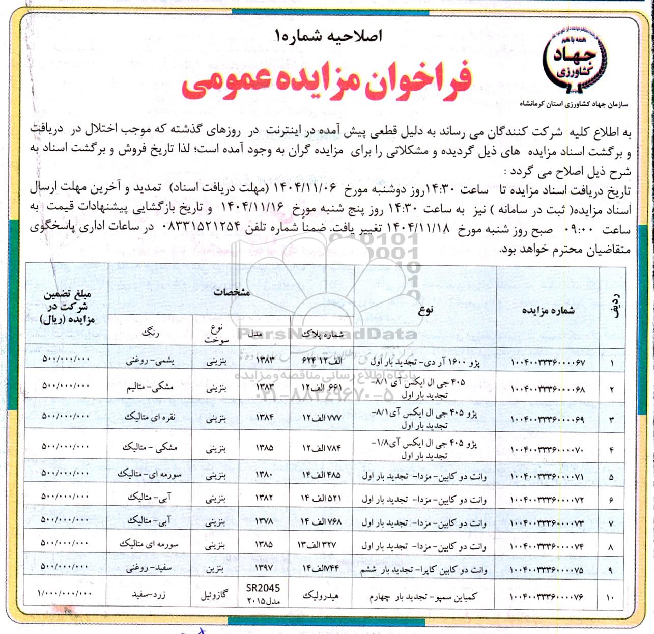 مزایده عمومی اصلاحیه مزایده فروش 10 دستگاه خودروی قابل شماره گذاری و یک دستگاه کمباین سمپو برگزار میگردد. از کلیه افراد متخصص و شرکتهای واجد شرایط دعوت به عمل میآید تا در این مزایده با کد خبرگزاری پارس نماد : 10169414 شرکت نمایند تاریخ شروع مزایده : 1404/11/01 مهلت شرکت در مزایده: تا پایان روز 1404/11/06 مکان برگزاری اموال واگذاری استانهای مزایدات استان کرمانشاه و دستهبندیهای مربوط به این حراجی ماشین آلات و تجهیزات کشاورزی و دام پروری, انواع خودرو سبک میباشد.