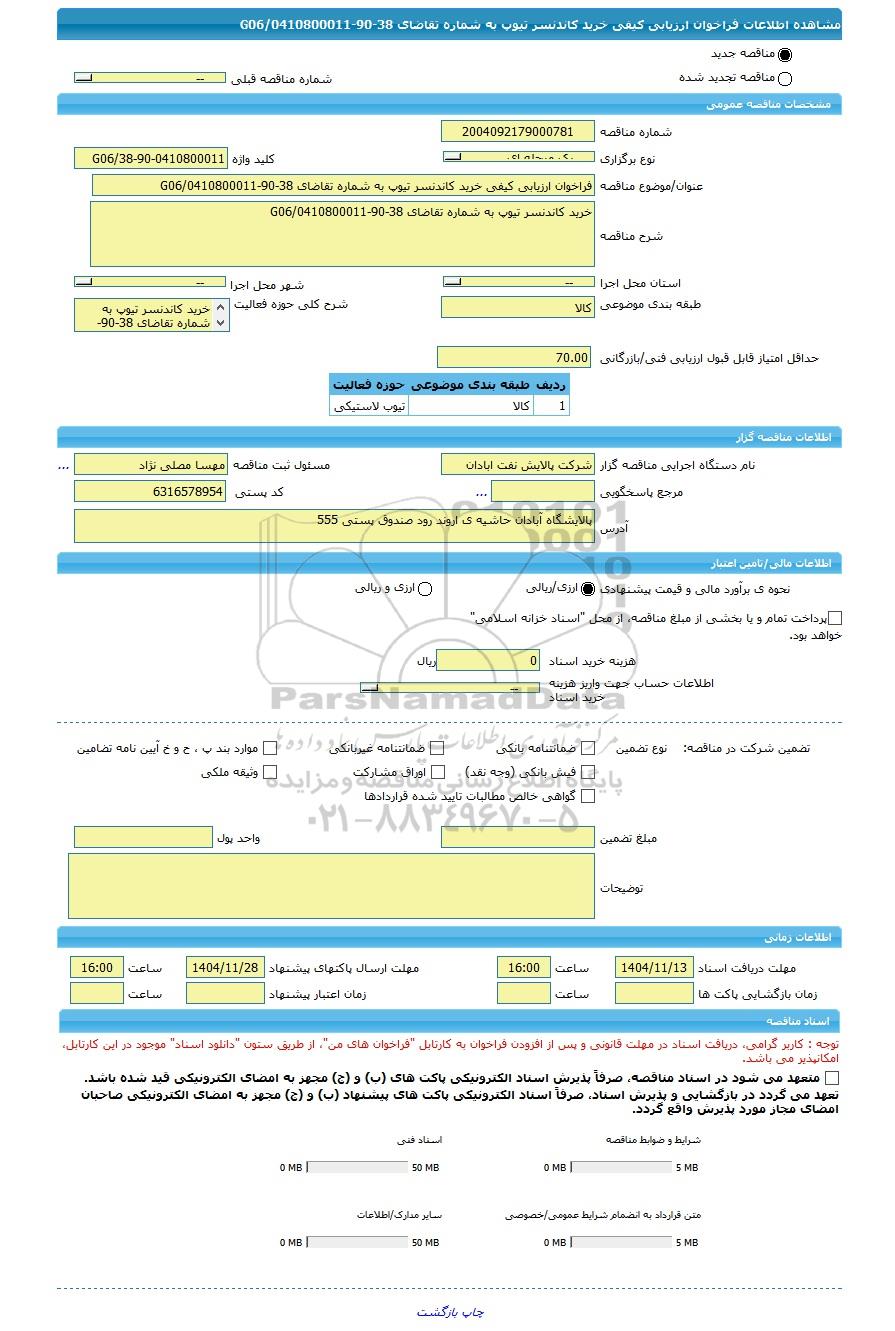 | شرح مناقصه | خرید کاندنسر تیوپ به شماره تقاضای 38-90-0410800011/G06 | ||||||||