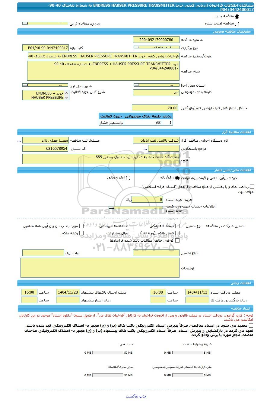 علاقهمندان میتوانند جهت دریافت اسناد و اطلاعات تکمیلی، مناقصه فراخوان ارزیابی کیفی خرید ENDRESS HAUSER PRESSURE TRANSMITTER به شماره تقاضای 40-90-0442400017/P04 با سامانه مناقصات و مزایدات ایران پارسنماد داده ها 88349670 تماس حاصل نمایند.