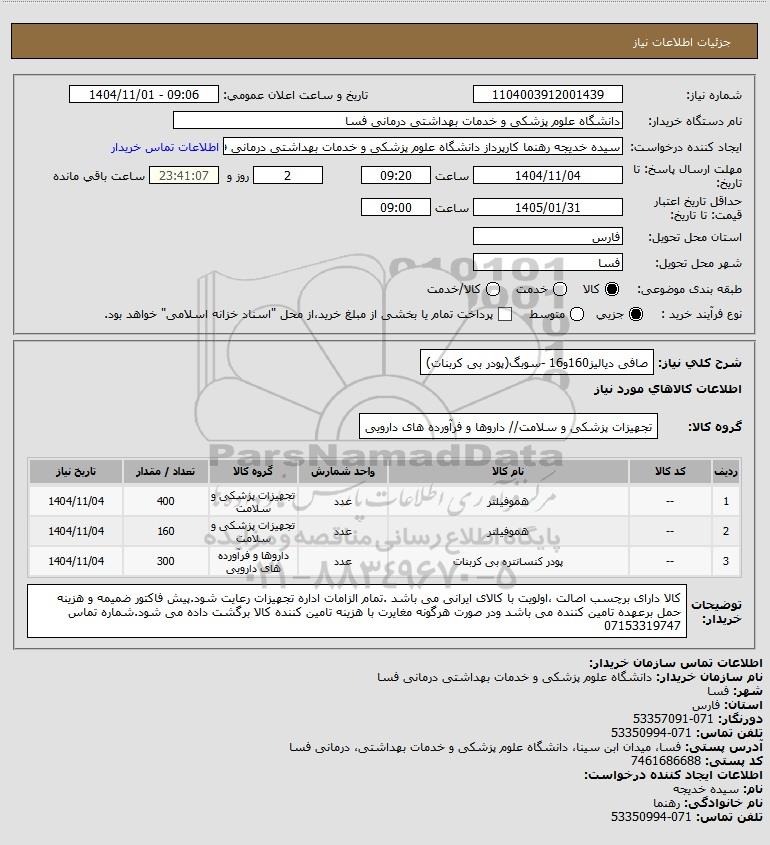 شرح کلی نیاز: صافی دیالیز160و16 -سوبگ(پودر بی کربنات)