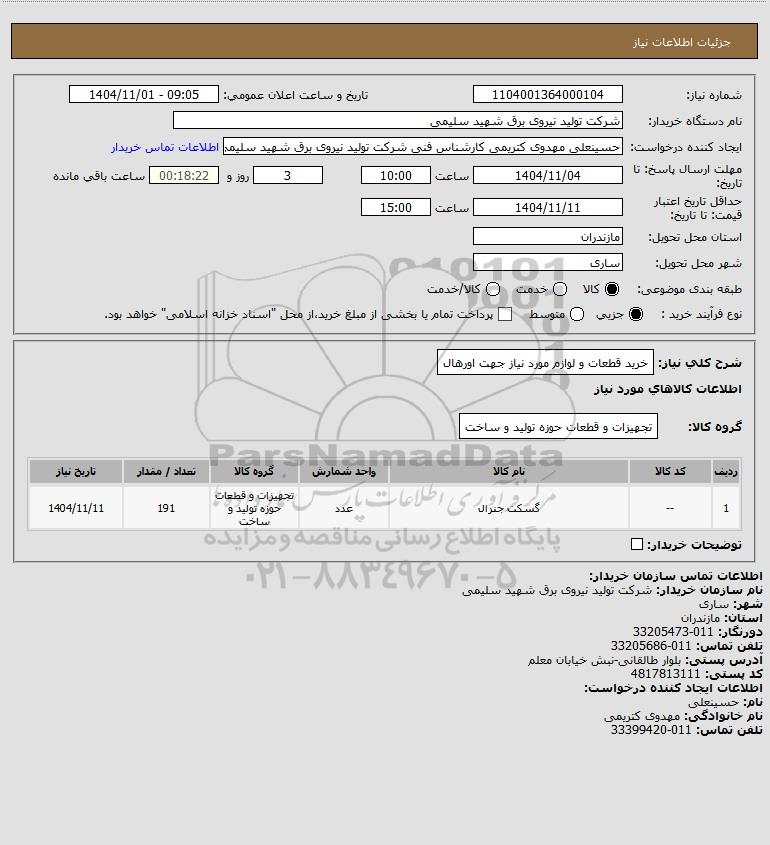 شرح کلی نیاز: خرید قطعات و لوازم مورد نیاز جهت اورهال
