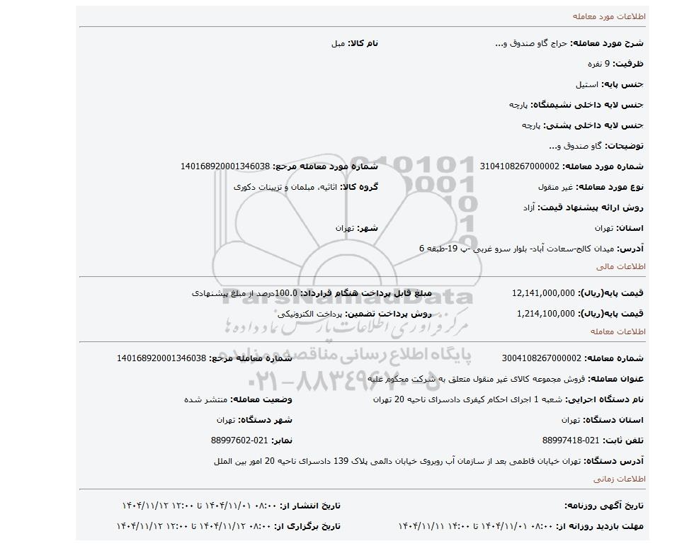 | شماره مورد معامله: 3104108267000002 | شماره مورد معامله مرجع: 140168920001346038 | |