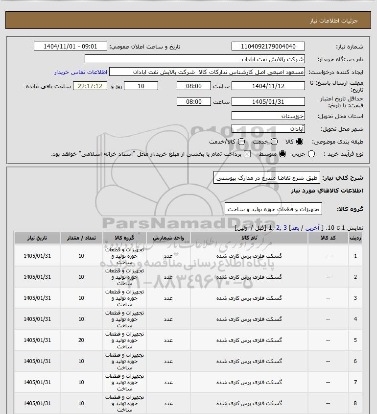 | 4 | -- | گسکت فلزی پرس کاری شده | عدد | تجهیزات و قطعات حوزه تولید و ساخت | 10 | 1405/01/31 |