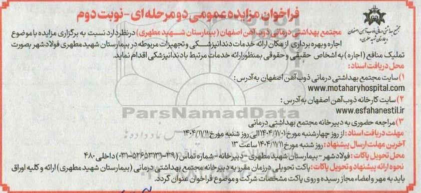 مجتمع بهداشتی درمانی ذوب آهن اصفهان (بیمارستان شهید مطهری) در نظر دارد نسبت به برگزاری مزایده با موضوع اجاره و بهره برداری از مکان ارائه خدمات دندانپزشکی و تجهیزات مربوطه در بیمارستان شهید مطهری فولادشهر بصورت تملیک منافع (اجاره) به اشخاص حقیقی و حقوقی بمنظور ارائه خدمات مرتبط با دندانپزشکی اقدام نماید