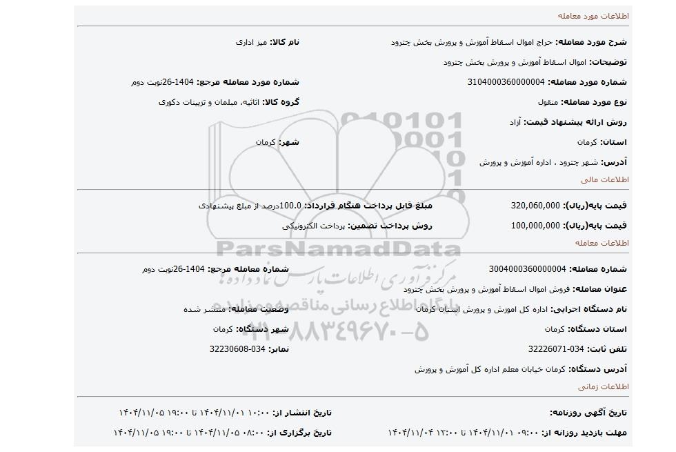 مزایده عمومی مزایده اموال اسقاط آموزش و پرورش بخش چترود برگزار میگردد. از کلیه افراد متخصص و شرکتهای واجد شرایط دعوت به عمل میآید تا در این مزایده با کد خبرگزاری پارس نماد : 10171473 شرکت نمایند تاریخ شروع مزایده : 1404/11/01 مهلت شرکت در مزایده: تا پایان روز 1404/11/05 مکان برگزاری اموال واگذاری استانهای مزایدات استان کرمان و دستهبندیهای مربوط به این حراجی متفرقه میباشد.