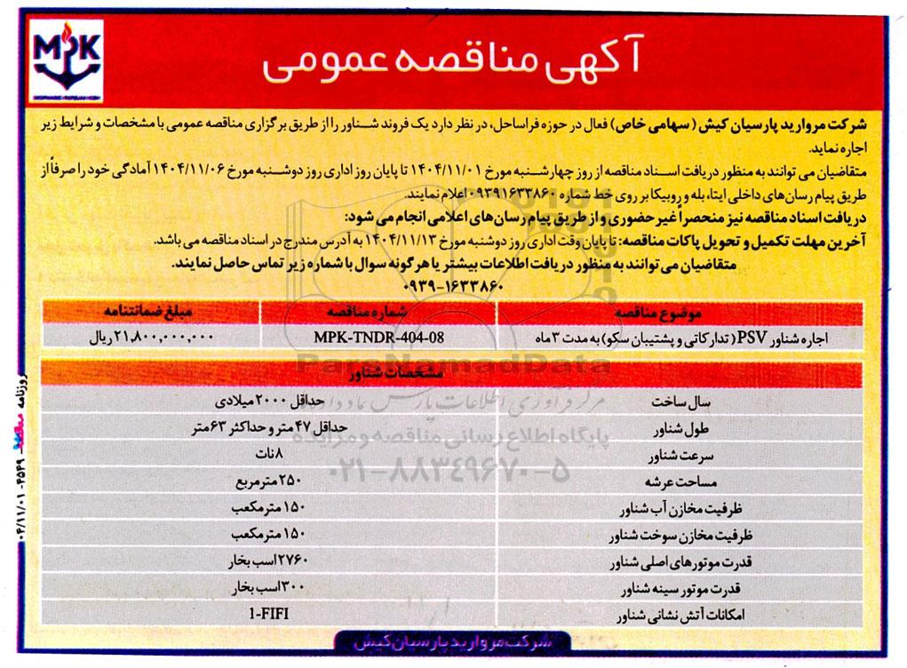 | اجاره شناور PSV (تدارکاتی و پشتیبان سکو) به مدت 3 ماه | MPK-TNDR-404-08 | 21.800.000.000 ریال |
