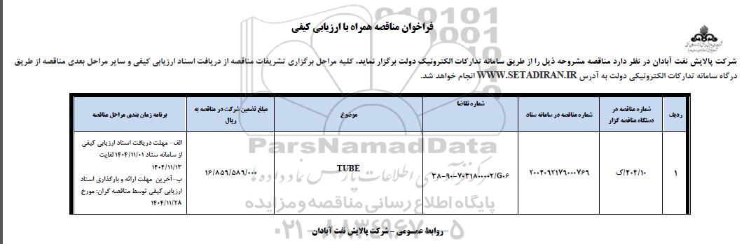 404/10/ک 2004092179000769 38-90-7031800002.G06 TUBE 16.859.589.000 الف- مهلت دریافت اسناد ارزیابی کیفی از سامانه ستاد از تاریخ 1404.11.1 لغایت 1404.11.12
