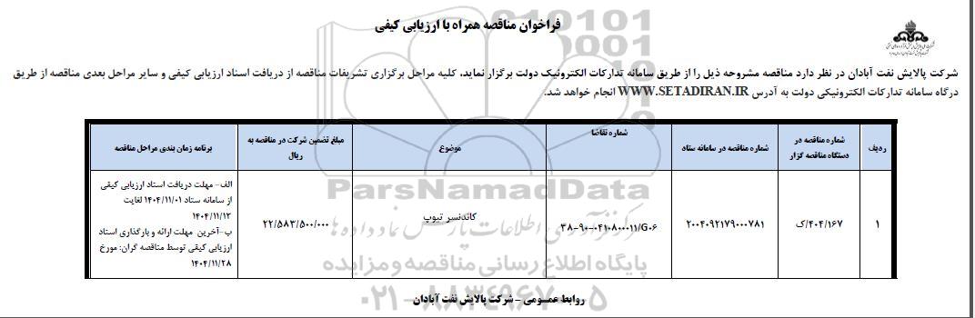 | 1 | 404/ 167/ ک | 2004092179000781 | 38-90-0410700011/g06 | کاندنسر تیوپ | 22.583.500.000 | الف- مهلت دریافت اسناد ارزیابی کیفی از سامانه ستاد 1404.11.1 لغایت 1404.11.12 ب- آخرین مهلت ارائه و بارگذاری اسناد ارزیابی کیفی توسط مناقصه گران مورخ 1404.11.28 |