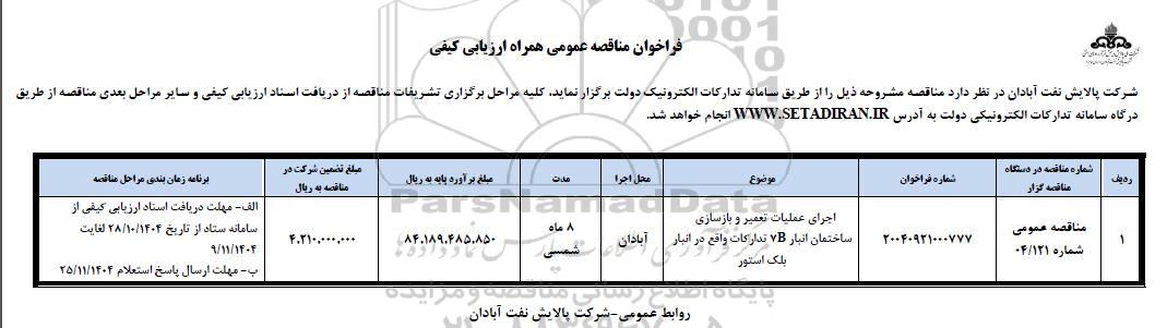 مناقصه عمومی شماره 04.121  2004092179000777  انجام عملیات تعمیر و بازسازی ساختمان انبار 7B تدارکات واقع در انیار بلک استور  آبادان  8 ماه شمسی   84.189.485.850  4.210.000.000  الف- مهلت دریافت اسناد ارزیابی کیفی از سامانه ستاد از تاریخ 1404.10.28 لغایت 1404.11.9