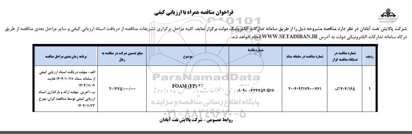 | 1 | 404/ 165/ ک | 2004092179000761 | 38-90-0432454/g17 | FOAM (FP) 3% | 20.475.000.000 | الف- مهلت دریافت اسناد ارزیابی کیفی از سامانه ستاد 1404.10.28 لغایت 1404.11.9 ب- آخرین مهلت ارائه و بارگذاری اسناد ارزیابی کیفی توسط مناقصه گران مورخ 1404.11.23 |
