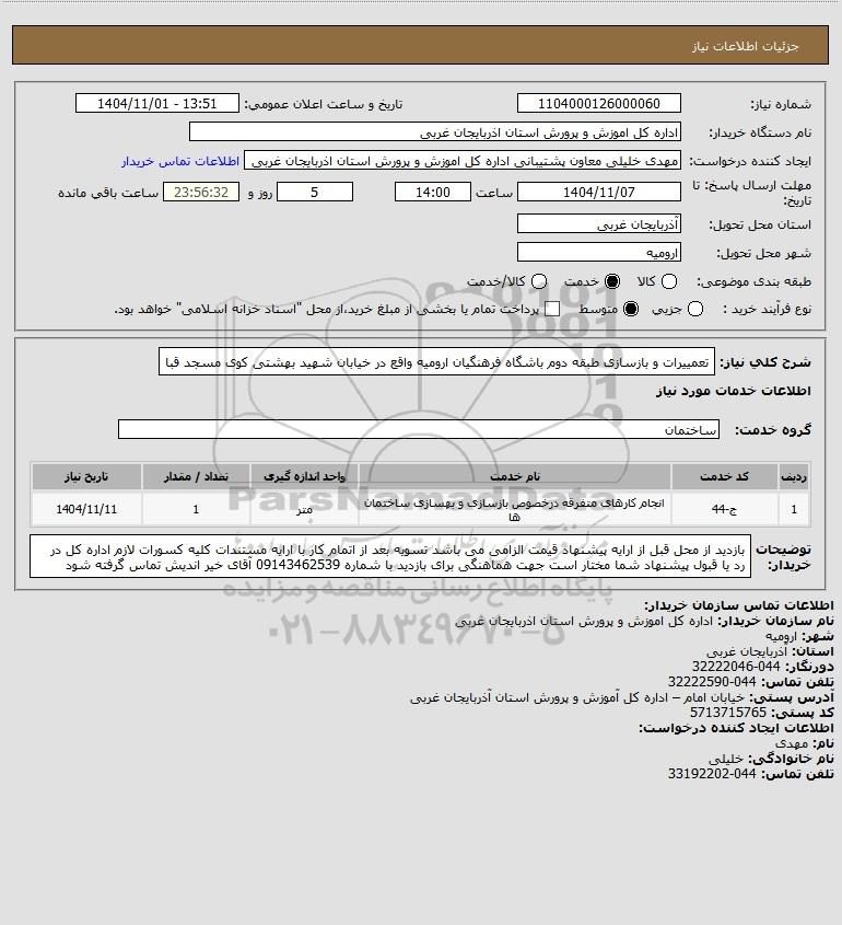 شرح کلی نیاز: تعمییرات و بازسازی طبقه دوم باشگاه فرهنگیان ارومیه واقع در خیابان شهید بهشتی کوی مسجد قبا