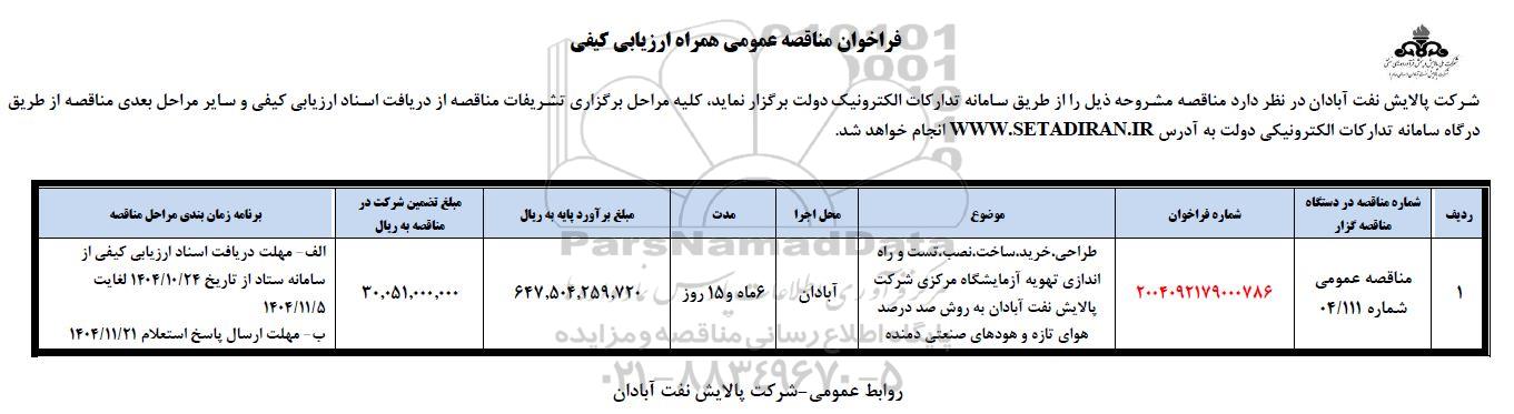 | 1 | مناقصه عمومی شماره 04.111 | 2004092179000786 | مناقصه طراحی،خرید ،ساخت ،نصب و تست و راه اندازی تهویه آزمایشگاه مرکزی شرکت پالایش نفت آبادان به روش صد در صد هوای تازه و هودهای صنعتی دمنده | آبادان | 6 ماه و 15 روز | 647.504.259.720 | 30.051.000.000 | الف- مهلت دریافت اسناد ارزیابی کیفی از سامانه ستاد از تاریخ 1404.10.24 لغایت 1404.11.5 ب- مهلت ارسال پاسخ استعلام 1404.11.21 |