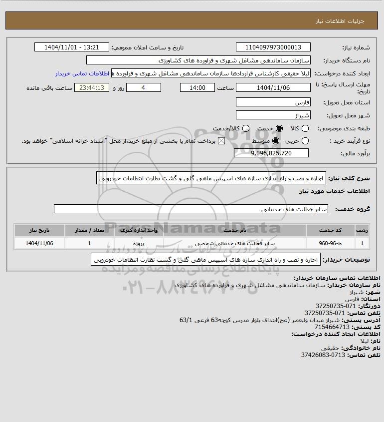 شرح کلی نیاز: اجاره و نصب و راه اندازی سازه های اسپیس ماهی گلی و گشت نظارت انتظامات خودرویی