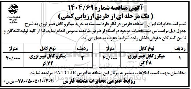 شرکت مخابرات ایران - منطقه فارس در نظر دارد نسبت به خرید میکرو کابل فیبر نوری به شرح جدول ذیل بر اساس مشخصات موجود در اسناد از طریق مناقصه عمومی اقدام نماید. لذا از کلیه تولید کنندگان و تامین کنندگان حقوقی داخلی واجد شرایط دعوت به عمل می آید.