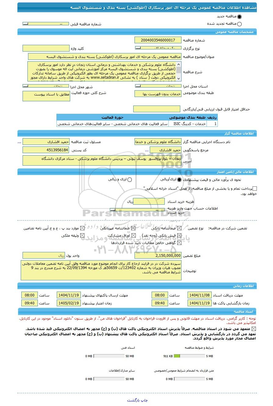 | شرح مناقصه | دانشگاه علوم پزشکی و خدمات بهداشتی و درمانی استان زنجان در نظر دارد امور پرسکاری (اطوکشی) بسته بندی و شستشوی البسه مرکز آموزشی درمانی آیت اله موسوی را بصورت حجمی از طریق برگزاری مناقصه عمومی یک مرحله ای بطور الکترونیکی از طریق سامانه تدارکات الکترونیکی دولت ( ستاد ) به نشانی www.setadiran.ir به شرکت های واجد شرایط دارای مجوز از اداره تعاون،کار و رفاه اجتماعی در رشته خدمات عمومی دارای حداقل رتبه 7 وفق اطلاعات و شرح مندرج در شرایط ذیل، شرایط اختصاصی، قرارداد، جداول و آنالیز های پیوست، واگذار نماید | ||||||||