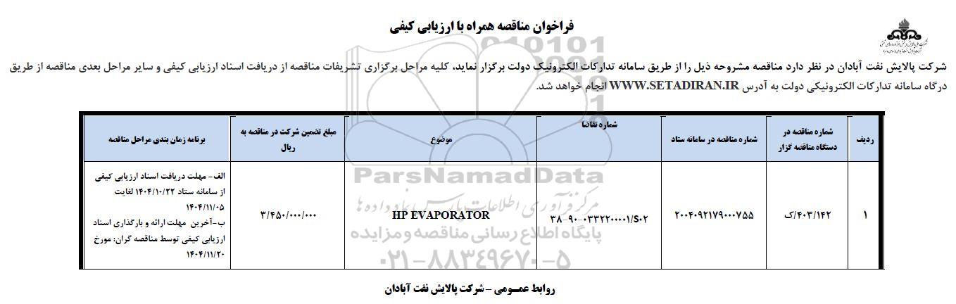 | 1 | 404/ 142/ ک | 2004092179000775 | 38-90-0332200001/S02 | HP EVAPORATOR | 3.450.000.000 | الف- مهلت دریافت اسناد ارزیابی کیفی از سامانه ستاد 1404.10.22 لغایت 1404.11.5 ب- آخرین مهلت ارائه و بارگذاری اسناد ارزیابی کیفی توسط مناقصه گران مورخ 1404.11.20 |