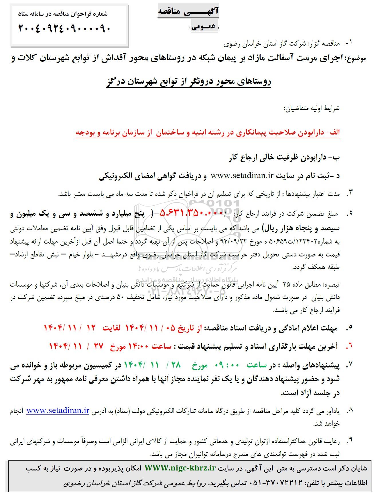 شایان ذکر است دسترسی به متن این آگهی در سایت WWW.nigc-khrz.ir امکان پذیر بوده و در صورت نیاز به کسب اطلاعات بیشتر با تلفن: 37072212-0251 تماس بگیرید.