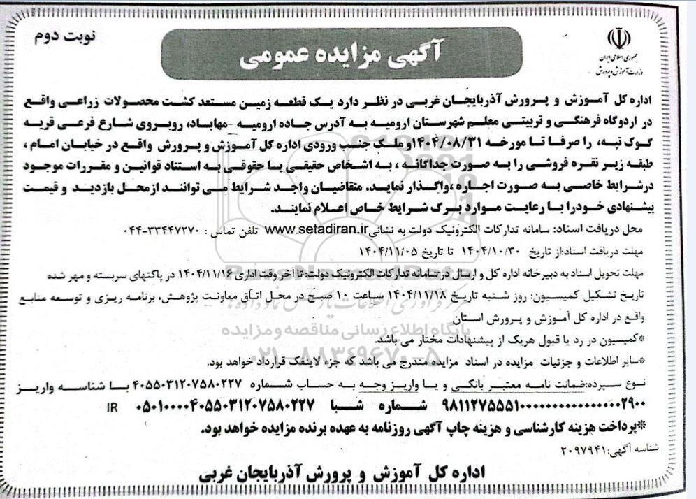 اداره کل آموزش و پرورش آذربایجان غربی در نظر دارد یک قطعه زمین مستعد کشت محصولات زراعی واقع در اردوگاه فرهنگی و تربیتی معلم شهرستان ارومیه به آدرس جاده ارومیه - مهاباد، روبروی شارع فرعی قریه گوگ تپه ، رابه صورت اجاره صرفا تا مورخه 1403.8.31 به اشخاص حقیقی یا حقوقی به استناد قوانین و مقررات موجود در شرایط خاصی واگذار نماید. متقاضیان واجد شرایط می توانند از محل بازدید و قیمت پیشنهادی خود را با رعایت موارد برگ شرایط خاص اعلام نمایند