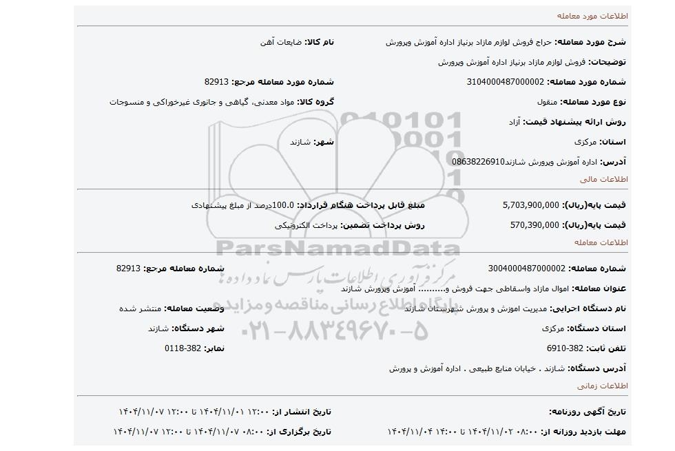 | عنوان معامله: اموال مازاد واسقاطی جهت فروش و.......... آموزش وپرورش شازند | ||