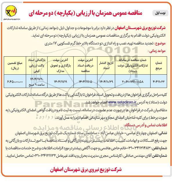 شرکت توزیع برق شهرستان اصفهان در نظر دارد برابر با موضوعات و جداول ذیل (مواعد زمانی) از طریق سامانه تدارکات الکترونیکی دولت اقدام به برگزاری مناقصات عمومی همزمان با ارزیابی (یکپارچه) دو مرحله ای نماید.