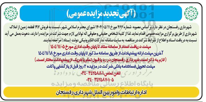 شهرداری رفسنجان در نظر دارد بر اساس مصوبه شماره 466 مورخ 1404.05.11 شورای محترم اسلامی شهر نسبت به فروش 197 قطعه زمین از املاک شهرداری از طریق برگزاری مزایده عمومی اقدام نماید لذا از کلیه اشخاص حقیقی و حقوقی که توانایی لازم جهت شرکت در مزایده را دارند ، دعوت بعمل می آید نسبت به دریافت اسناد و اطلاع از شرایط شرکت در مناقصه به سایت سامانه تدارکات الکترونیکی دولت (ستاد ) مراجعه نمایند.