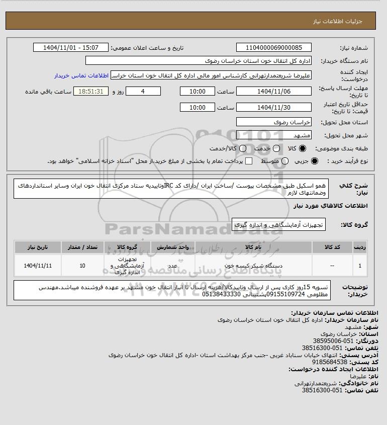 نام دستگاه خریدار:اداره کل انتقال خون استان خراسان رضوی