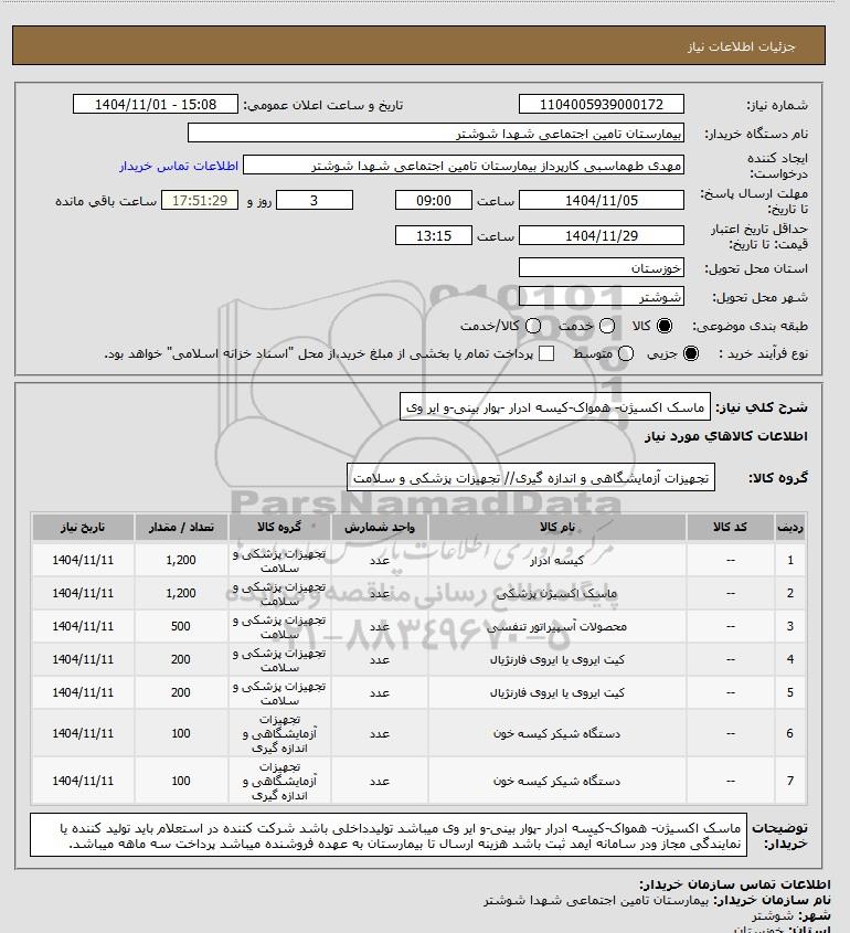 | 2 | -- | ماسک اکسیژن پزشکی | عدد | تجهیزات پزشکی و سلامت | 1,200 | 1404/11/11 |