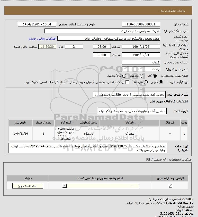 شرح کلی نیاز: باطری قابل شارژ اسیدی 48ولت -350آمپر (لیفتراک اریا