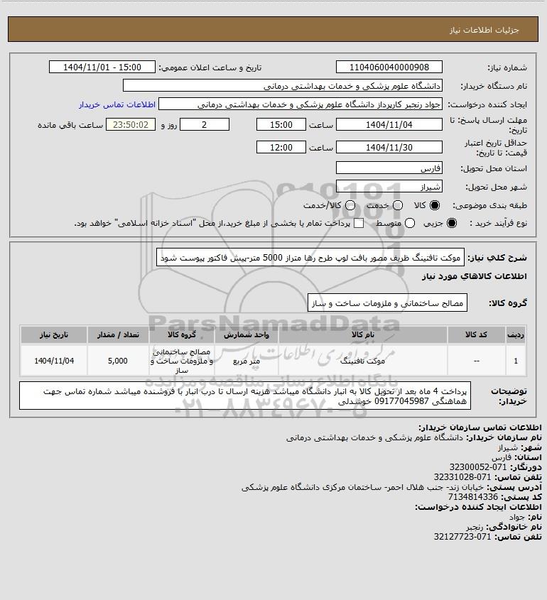 | 1 | -- | موکت تافتینگ | متر مربع | مصالح ساختمانی و ملزومات ساخت و ساز | 5,000 | 1404/11/04 |