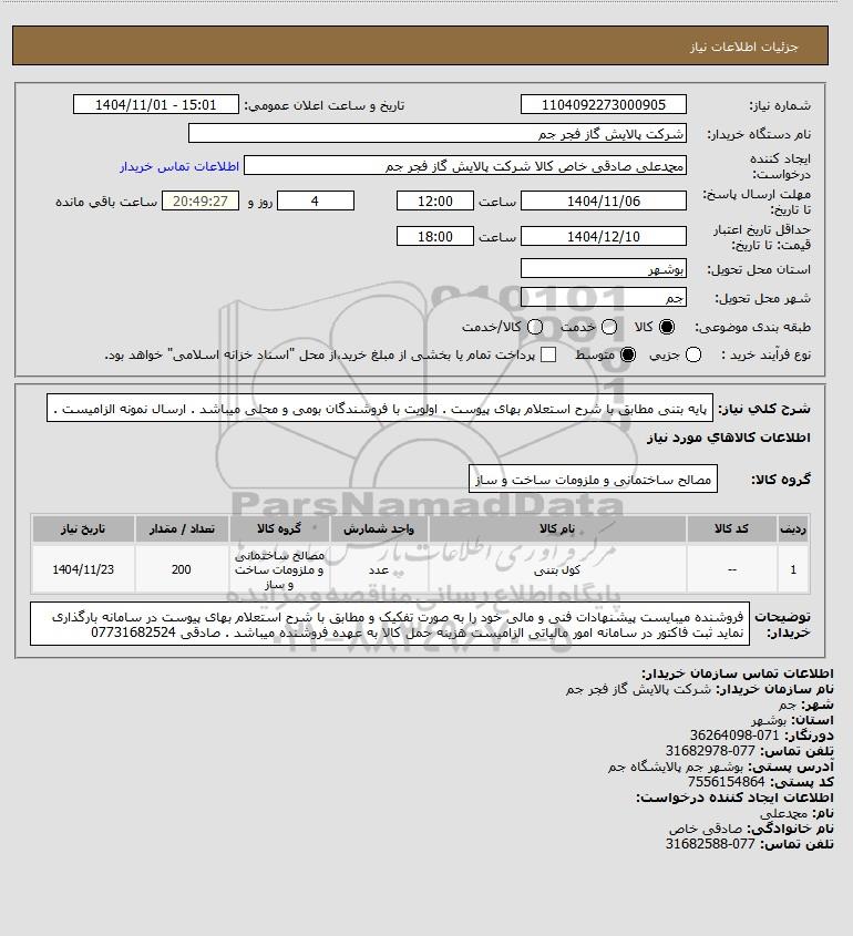 | 1 | -- | کول بتنی | عدد | مصالح ساختمانی و ملزومات ساخت و ساز | 200 | 1404/11/23 |