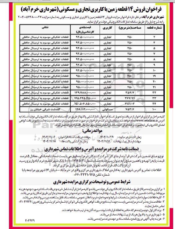 فراخوان فروش 14 قطعه زمین با کاربری تجاری و مسکونی (شهرداری خرم آباد)