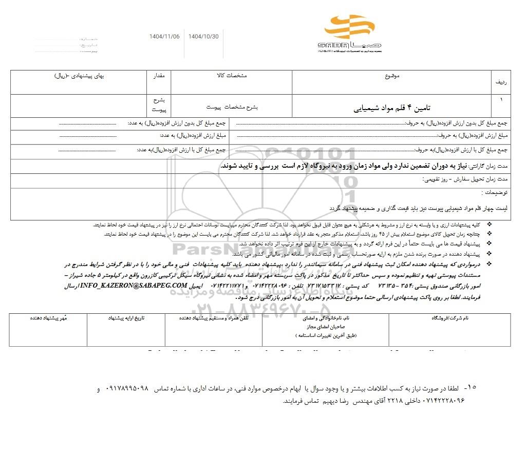 تلفن: 07142228096 و 07142211771 ایمیل INFO_KAZERON@SABAPEG.COM ارسال فرمایند.