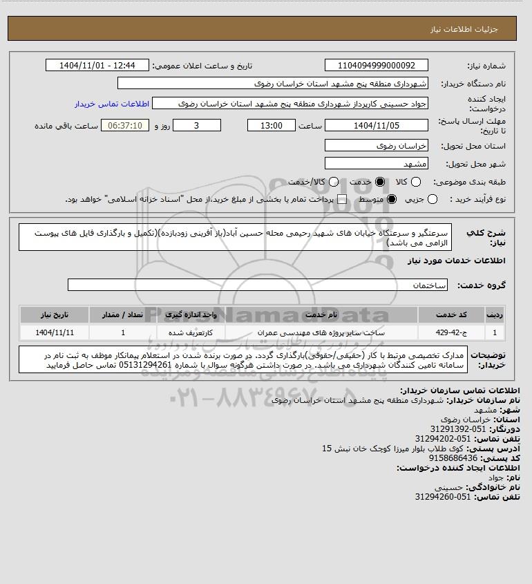 نام سازمان خریدار: شهرداری منطقه پنج مشهد استان خراسان رضوی