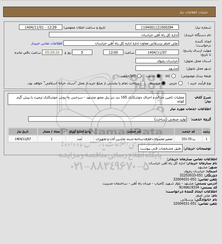شرح کلی نیاز: عملیات تامین مصالح و اجرای جوشکاری 165 بند درز ریل محور مشهد - سرخس به روش جوشکاری ترمیت با پیش گرم کوتاه