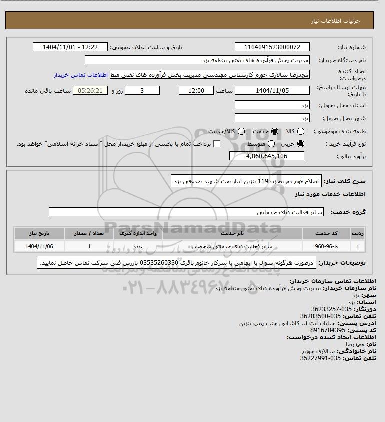 شرح کلی نیاز: اصلاح فوم دم مخزن 119 بنزین انبار نفت شهید صدوقی یزد