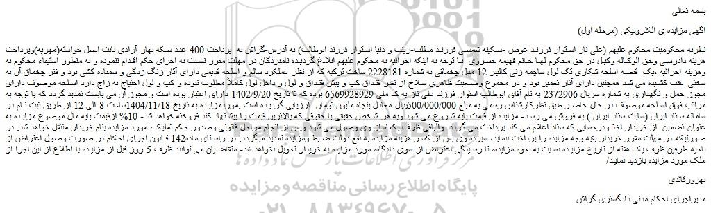 نظربه محکومیت محکوم علیهم (علی ناز استوار فرزند عوض -سکینه شمسی فرزند مطلب-زینب و دنیا استوار فرزند ابوطالب) به آدرس-گراش به  پرداخت 400 عدد سکه بهار آزادی بابت اصل خواسته(مهریه)وپرداخت هزینه دادرسی وحق الوکاله وکیل در حق محکوم لها خانم فهیمه خسروی  با توجه به اینکه اجرائیه به محکوم علیهم ابلاغ گردیده نامبردگان در مهلت مقرر نسبت به اجرای حکم اقدام ننموده و به منظور استیفاء محکوم به وهزینه اجرائیه ،یک   قبضه اسلحه شکاری تک لول ساچمه زنی کالیبر 12 مدل چخماقی به شماره 2228181 ساخت ترکیه که از نظر عملکرد سالم و اسلحه قدیمی دارای آثار زنگ زدگی و سمباده کشی بود و فنر چخماق آن به سختی عقب کشیده می شد همچنین دارای آثار تعمیر بود و در مجموع وضعیت ظاهری سلاح از نظر قنداق کپ و پیش قنداق و لول و داخل لول کاملاً مطلوب نبوده و کپ و لول احتیاج به زاج دارد اسلحه موصوف دارای مجوز حمل و نگهداری به شماره سریال 2372906 به نام آقای ابوطالب استوار فرزند علی ناز به کد ملی 6569928929 بوده که تا تاریخ 1402/9/20 دارای اعتبار بوده است و مجوز آن می بایست تمدید گردد که با توجه به مراتب فوق اسلحه موصوف در حال حاضر طبق نظرکارشناس رسمی به مبلغ 500/000/000ریال معادل پنجاه ملیون تومان  ارزیابی گردیده است .موردمزایده به تاریخ 1404/11/18ساعت 8 الی 12 از طریق ثبت نام در سامانه ستاد ایران (سایت ستاد ایران ) به فروش می رسد- مزایده از قیمت پایه شروع می شود وبه هر شخص حقیقی یا حقوقی که بالاترین قیمت را پیشنهاد کند فروخته خواهد شد- 10% ازقیمت پایه مال موضوع مزایده به عنوان تضمین  از خریدار اخذ ودرحسابی که ستاد اعلام می کند پرداخت می گردد  والباقی ظرف یکماه از وی وصول می شود وپس از انجام مراحل قانونی وصدور حکم تملیک، مورد مزایده بنام خریدار منتقل خواهد شد. در صورتیکه در مهلت مقرر خریدار بقیه وجه مزایده را پرداخت ننماید، سپرده وی پس از کسر هزینه مزایده به نفع دولت ضبط ومزایده تمدید میگردد. در راستای ماده142 قانون اجرای احکام در صورت وصول اعتراض از ناحیه طرفین ظرف یک هفته از تاریخ مزایده نسبت به نحوه مزایده، تا رسیدگی اعتراض از سوی دادگاه، مورد مزایده به خریدار تحویل نخواهد شد- متقاضیان می توانند ظرف 5 روز قبل از مزایده با اطلاع از این اجرا از ملک مورد مزایده بازدید نمایند/