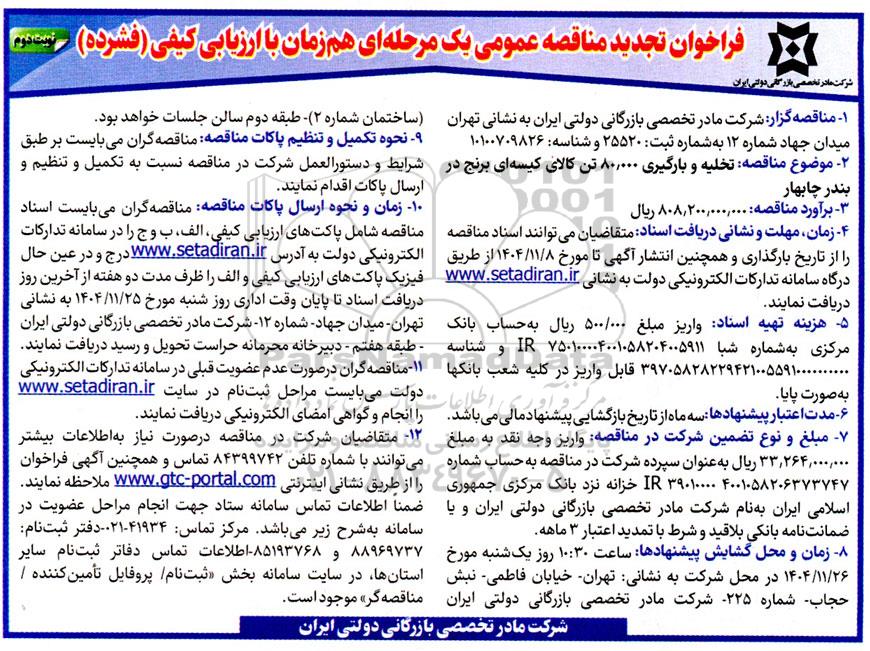 تجدید مناقصه تخلیه و بارگیری 80.000 تن کالای کیسه ای برنج- نوبت دوم, تجدید مناقصه تخلیه و بارگیری 80.000 تن کالای کیسه ای برنج- نوبت دوم
